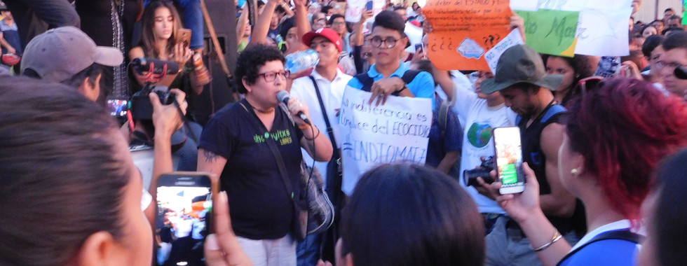 Caminamos gritando consignas y pregonando un mensaje por la naturaleza. Al llegar al monumento sentimos que habíamos logrado una de las más grandes hazañas; esa plaza tenía un valor "de oro" para el régimen de los Ortega-Murillo y nadie, nunca, se había atrevido a manifestarse en dicho lugar. Pero lo difícil estaba por venir: en cuestión de segundos llegaron policías armados en motocicletas y muchos jóvenes pro Ortega de una manera furiosa y violenta. A mí me tenían agarrado dos policías de las manos, pero logré zafarme a como pude. En cuestión se segundos estábamos rodeados por decenas de antimotines y detrás de ellos las turbas. ¡Había que correr!