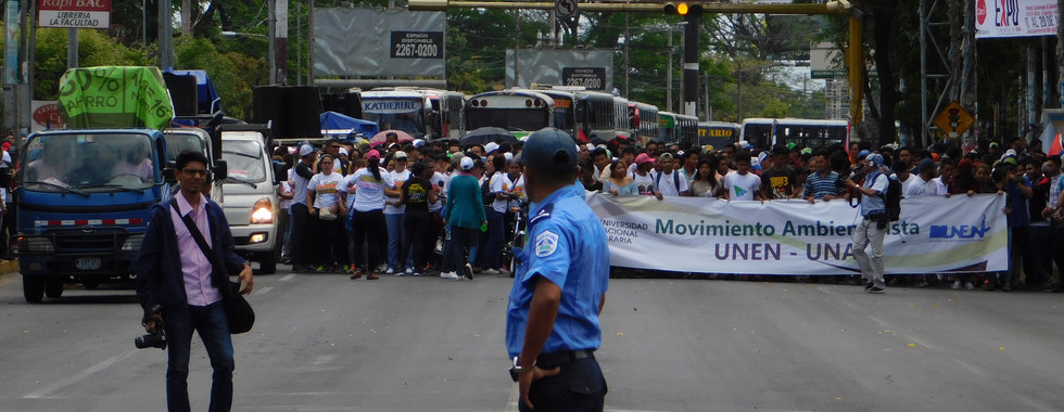 El 12 de abril nos volvimos a reunir para otra manifestación, con el mismo objetivo. La idea era marchar hacia la Asamblea orteguista desde las afueras de la UCA. Inmediatamente fue convocada por el régimen una contramarcha con la misma ruta. Los jóvenes que pedíamos acciones contundentes en contra del incendio en Indio-Maíz cambiamos la ruta de la marcha. El jueves 12 de abril nos reunimos desde las 9:30 a.m. frente a la UCA; a esa hora, frente a nosotros, trabajadores del Estado, muchos policías y juventud orteguista, pasaron ondeando las banderas del partido de Ortega, pero no se dieron incidentes. Esperamos que pasara el último de ellos para arrancar nuestra marcha hacia el Monumento de Alexis Argüello.