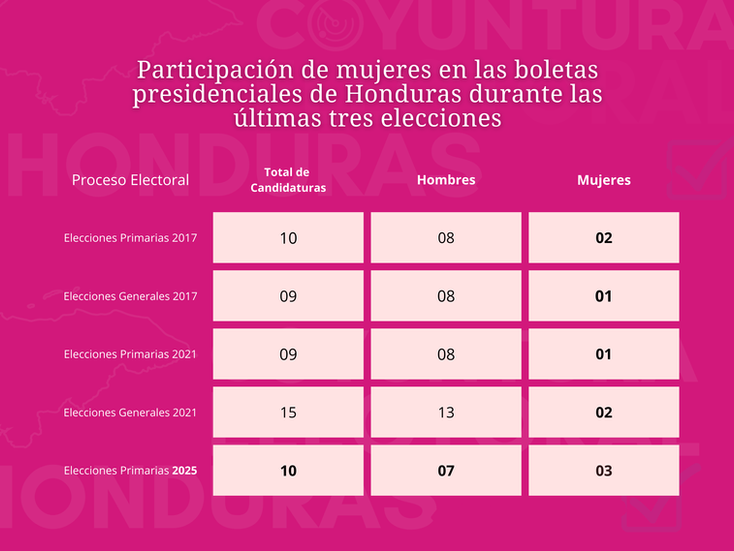 La contienda se desarrolla en un país donde, pese a avances en la representación política de las mujeres, el poder sigue estando mayoritariamente en manos de estructuras dominadas por hombres. A diferencia de 2021, cuando solo una mujer compitió entre nueve precandidatos, esta vez hay tres de un total de diez aspirantes, cada una liderando la fórmula de los tres partidos habilitados para el proceso: el Partido Liberal de Honduras (PLH), el Partido Nacional de Honduras (PNH) y el oficialista Libertad y Refundación (LIBRE).